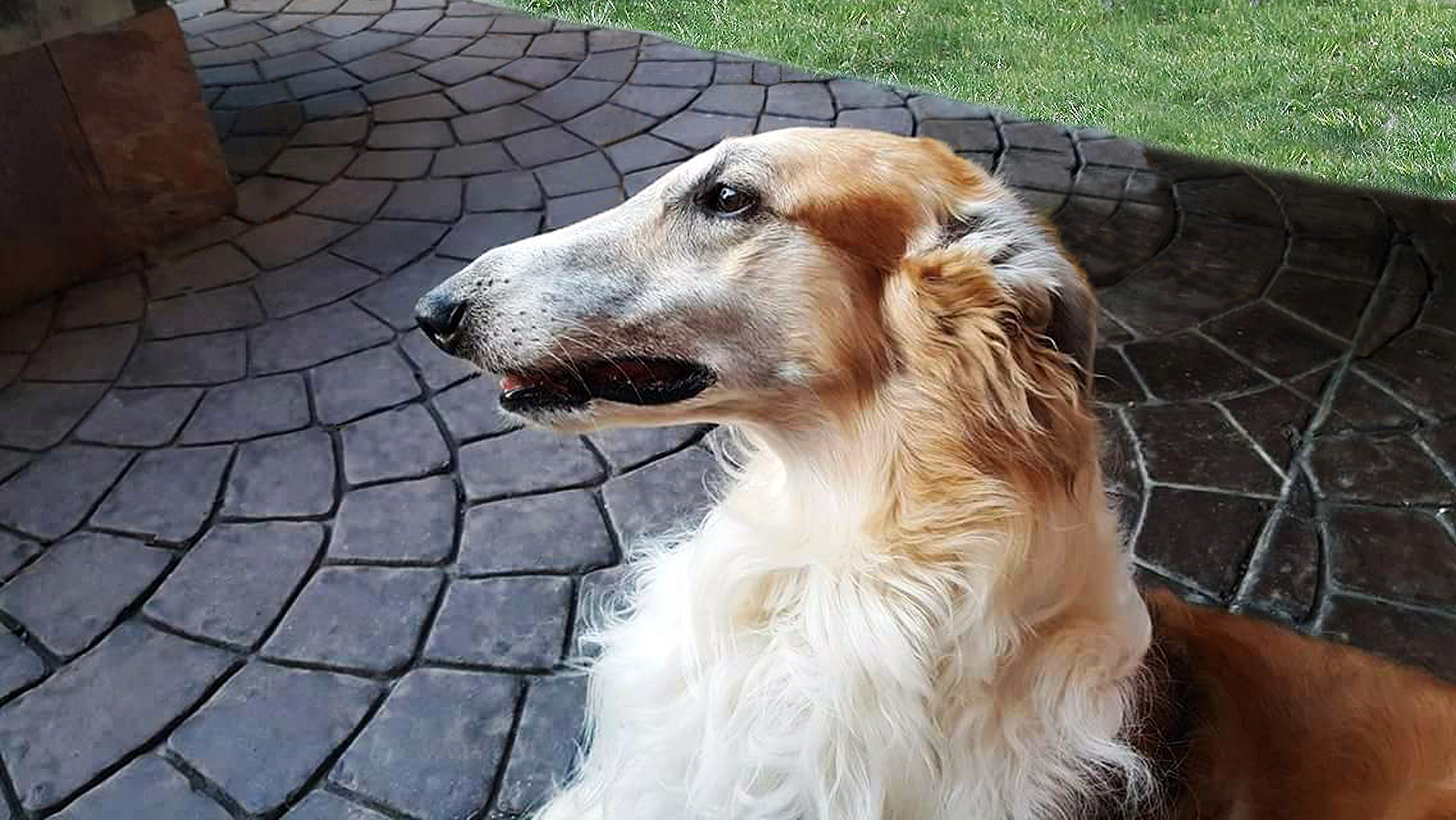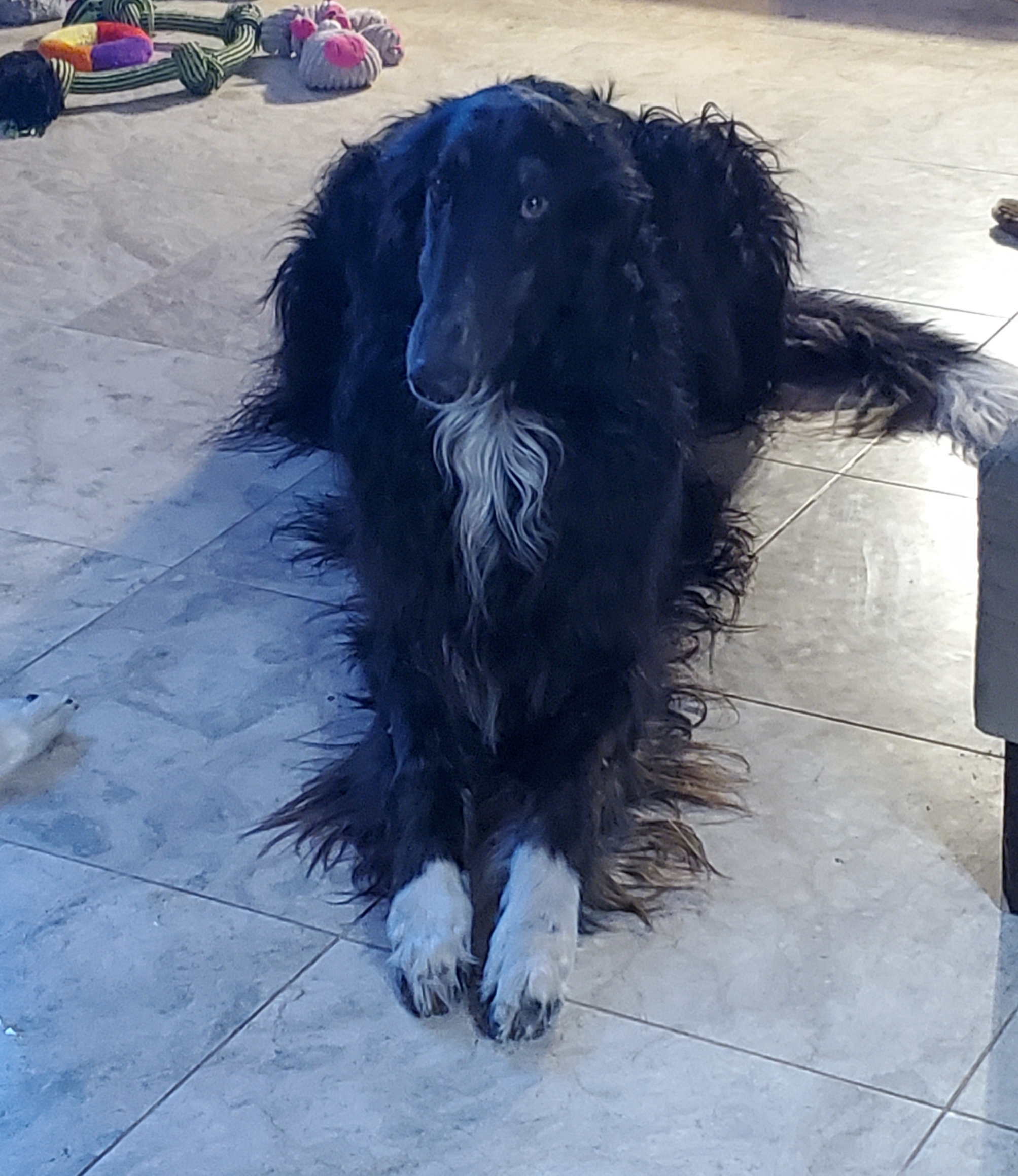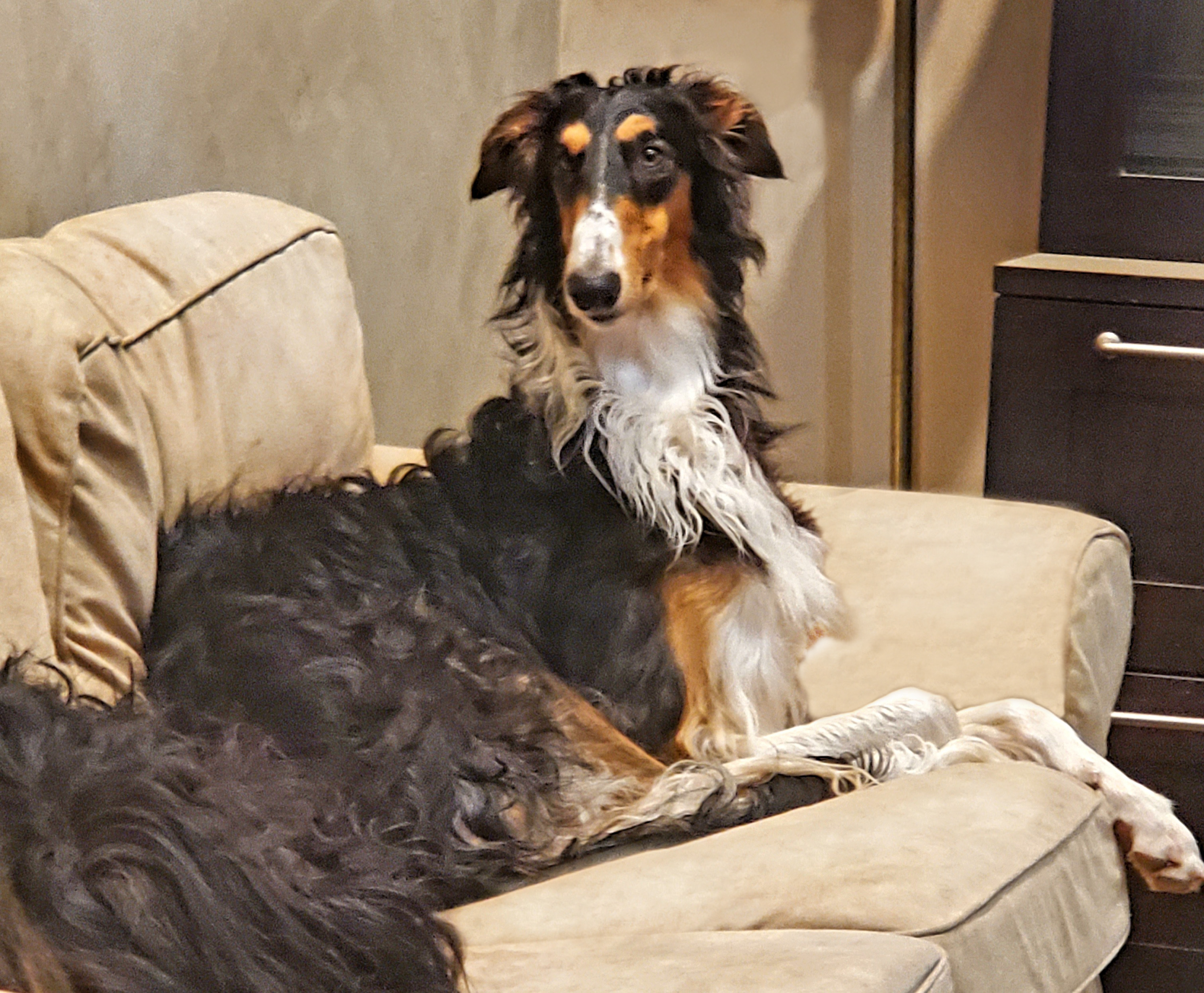 Rufus was my "pick male" from the "Show and Tell" litter sired by GCh Estet Classic Tihomir and out of GCh. Sunburst Ellicit Dream JC. He originally went back east to a show home, but as sometimes happens, it didn't "Click" and so home he came and home he will remain! Slightly smaller - at 32 inches - than his two brothers above, he turns heads with his ground-covering movement. Rufus finished his Championship, but hasn't yet decided what he wants to do next.... campaign....? lure coursing....?? dock diving....?? oh, Rufus!! | See Rufus' PEDIGREE